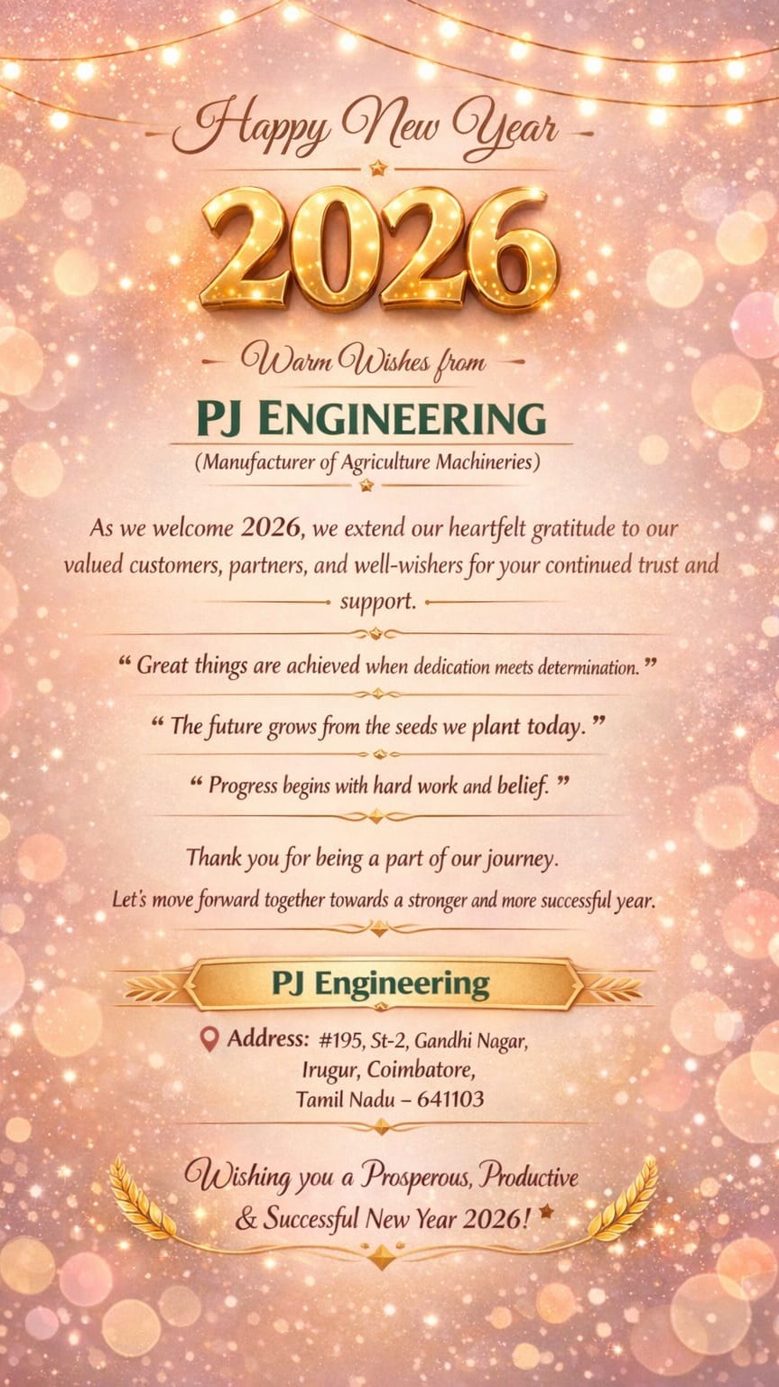 WE THANK EACH AND EVERY PERSONS WHO MADES OUR BUSINESS TO REACH THE CUSTOMER END.THANKS A LOTS FOR THE SUPPORTERS,DEALERS,, CUSTOMER, REFERRALS AND ALSO OUR STAFFS.WE ARE WISH YOU A HAPPY NEW YEAR.THIS YEAR BRINGS YOU A LOT OF HAPPINESS AND MEMORIES.A BEST WISHES FOR AL YOUR WISH COMES TRUE IN THIS YEAR.#PJ ENGINEERING #HAPPY NEW YEAR #OFFERS #MANUFACTURER #INSTAGRAM TRENDING #INS #INSTAGRAM REELS #NEW YEAR WISHES